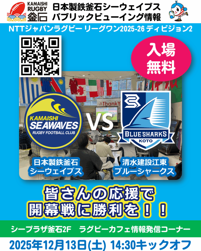 【パブリックビューイング】日本製鉄釜石シーウェイブス VS 清水建設江東ブルーシャークス【12/13(土)】