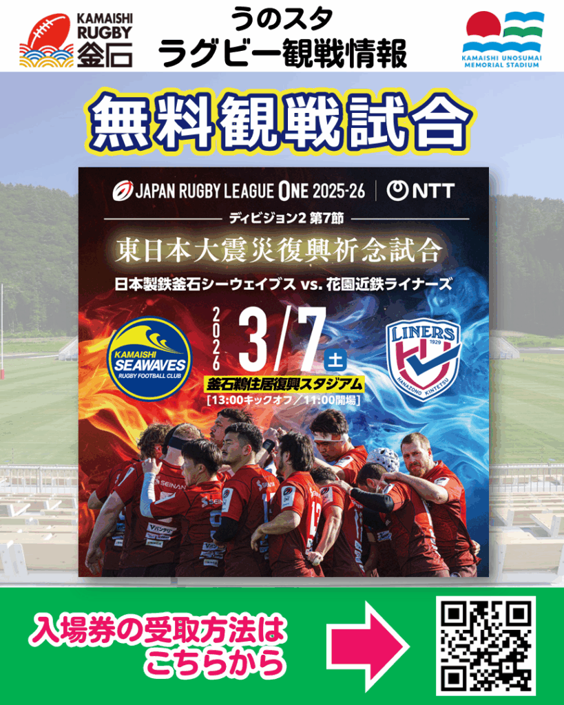 【3/7(土)うのスタ】日本製鉄釜石シーウェイブス VS 花園近鉄ライナーズ【無料観戦試合】