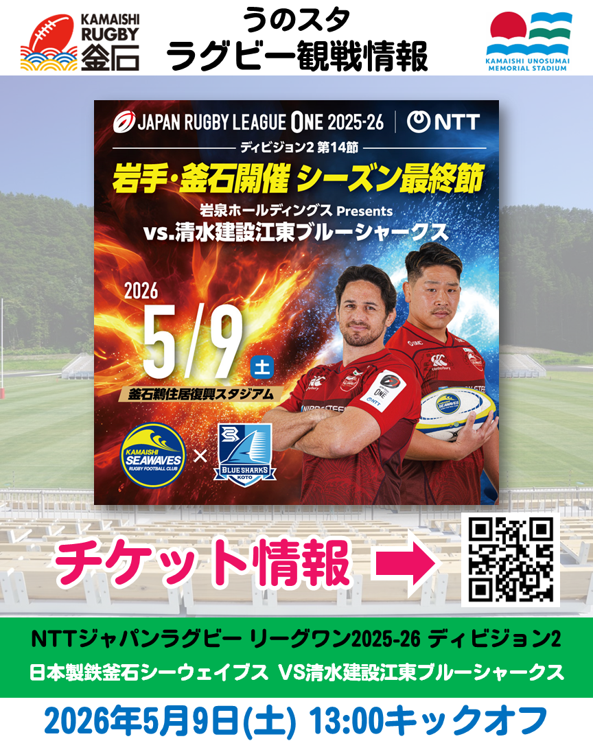 【5/9(土)うのスタ】日本製鉄釜石シーウェイブス VS 清水建設江東ブルーシャークス【チケット販売中】
