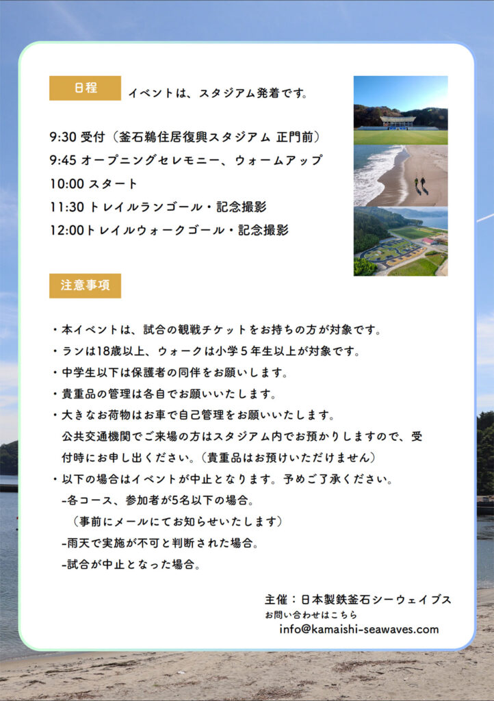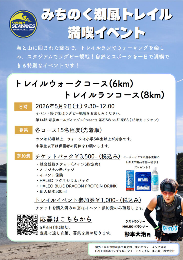 海と山に囲まれた釜石で、トレイルランやウォーキングを楽しみ、スタジアムでラグビー観戦!自然とスポーツを一日で満喫できる特別なイベントです。