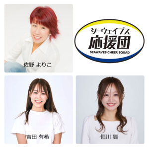 | 内容 | 岩手県内のテレビやラジオ、イベントに多数出演の人気タレント 吉田有希さんと、恒川舞さん、釜石市鵜住居町出身の民謡歌手・佐野よりこさんが来場。開門時のお出迎えや応援レクチャーに登場。一緒にシーウェイブスを応援しましょう! |
