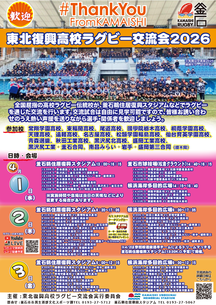 参加校関係者及び保護者の皆様は、YouTube釜石市公式チャンネル「ラグビーのまち釜石」にチャンネル登録いただき、当日の交流試合ライブ配信及びアーカイブ配信をご覧いただきますようお願いします。